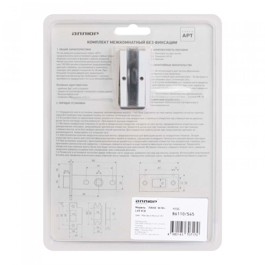 АЛЛЮР АРТ "ЛАНА" W/W+L45-8 W (86110/S45) матовый белый Комплект ручка и защелка, цены